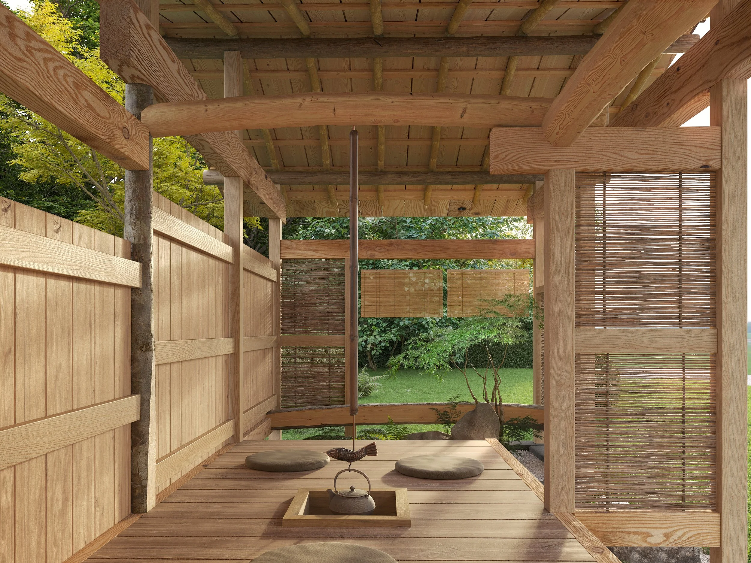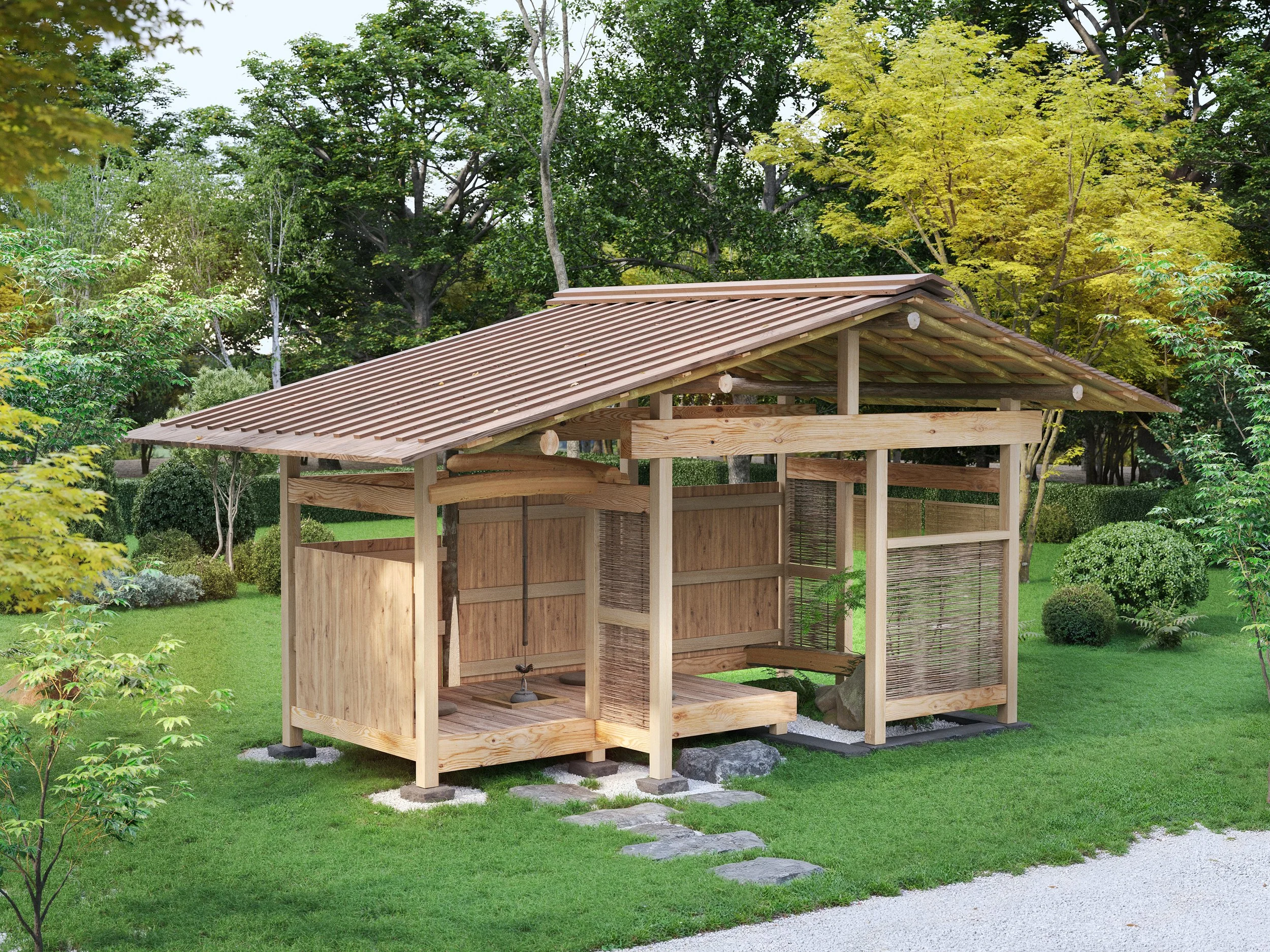 The structure follows the form of an azumaya, the traditional garden arbour, but incorporates elements of the tea house — among them a sunken hearth, the ro, set into the timber floor. It is designed in the spirit of the sencha tradition, where the practice of tea moves outdoors and the boundary between shelter and landscape dissolves. Enclosure is suggested rather than built.